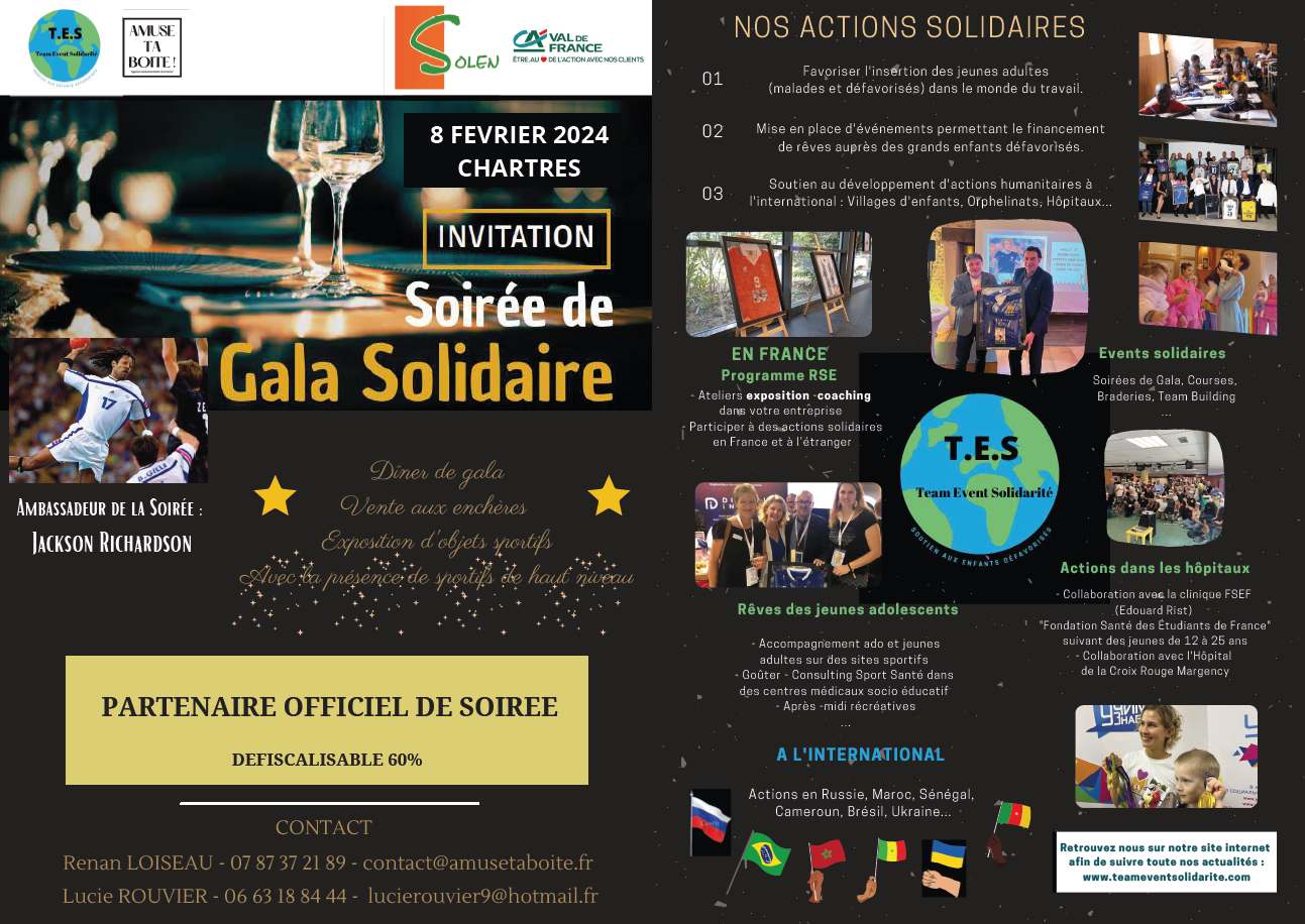 Pour la deuxième année consécutive, le groupe SOLEN est fier d’annoncer sa participation à l’organisation de la soirée de Gala Solidaire qui se tiendra à Chartres le jeudi 8 février 2024. Cet événement exceptionnel vise à soutenir l’Association Team Event Solidarité (TES), œuvrant pour soutenir et aider des enfants en difficulté et dans le besoin.
